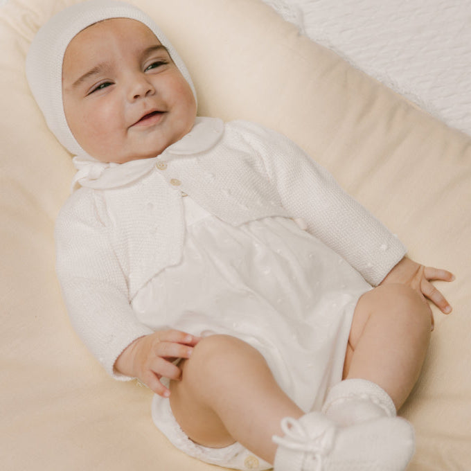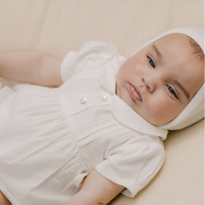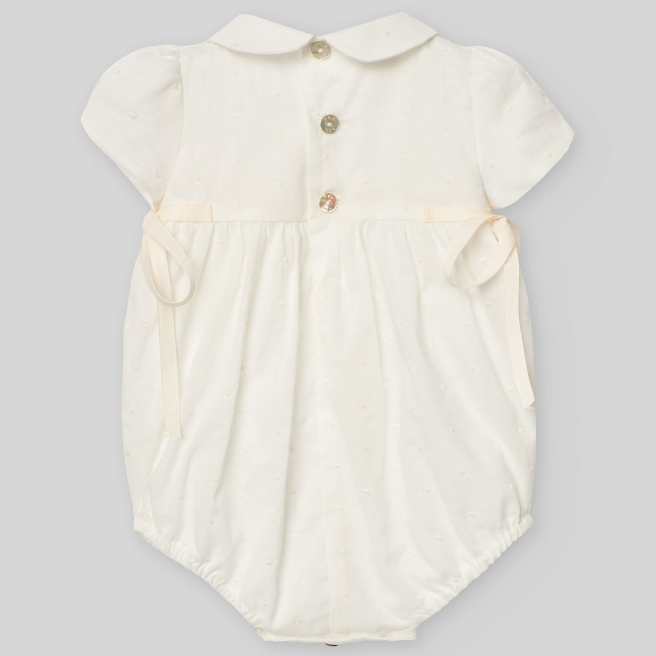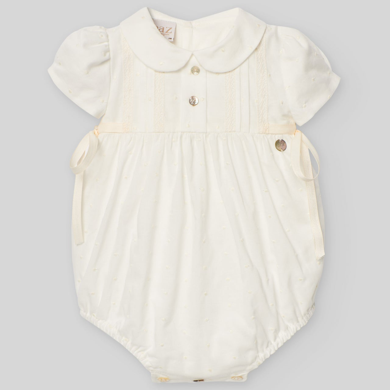 Un encantador pelele en marfil para bebé de PAZ Rodríguez. Ideal para bautizo, ceremonia o eventos especiales. Tejido con bodoques bordados y botones decorativos en el delantero. Esta pieza única tiene un cuello redondeado de estilo Peter Pan, ribetes de encaje, plumeti y lazos decorativos en ambos lados. Hay botones en la parte trasera y entre las piernas para vestir y cambiar fácilmente. Está completamente forrado para mayor comodidad.