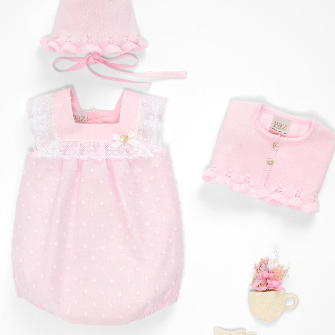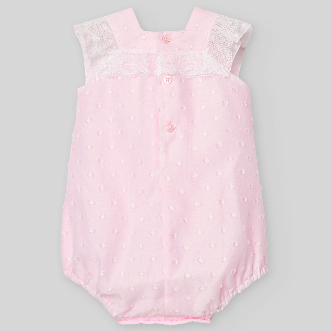 Pelele corto sin mangas para bebé niña, diseñado con un toque elegante y delicado. Adornado con una encantadora puntilla en contraste y un lazo decorado con una chapa de nácar PAZ. Confeccionado en organza con detalles de plumeti, cuenta con un cierre trasero de botones. Incorpora un elástico en el bajo para mayor comodidad y una práctica abertura con botones en la entrepierna, que facilita el cambio de pañal.