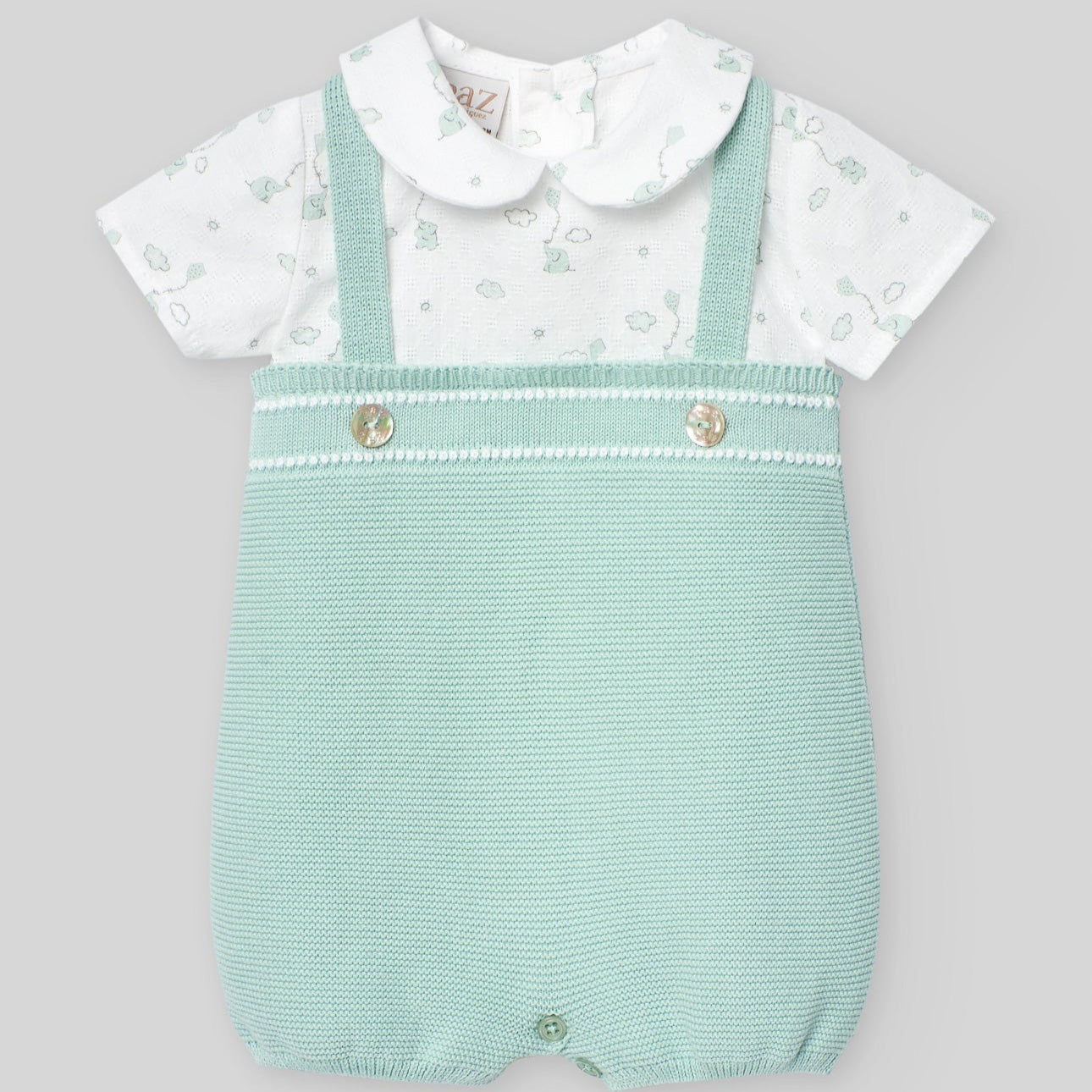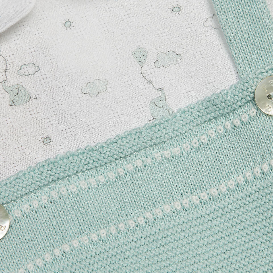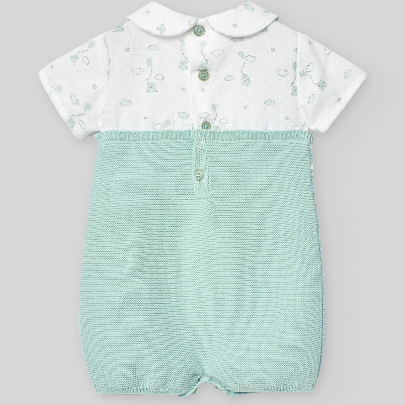 Pelele para bebé, confeccionado en una combinación de punto y tela. La parte inferior en suave punto presenta dos botones de nácar decorativos y tirantes emulando un peto. La parte superior, en tejido con un dulce estampado de elefantes y nubes, tiene cuello bebé y manga corta. Cierre trasero con botones a tono. Cuenta con un cierre trasero de botones y una práctica abertura en la entrepierna con botones para facilitar el cambio de pañal.