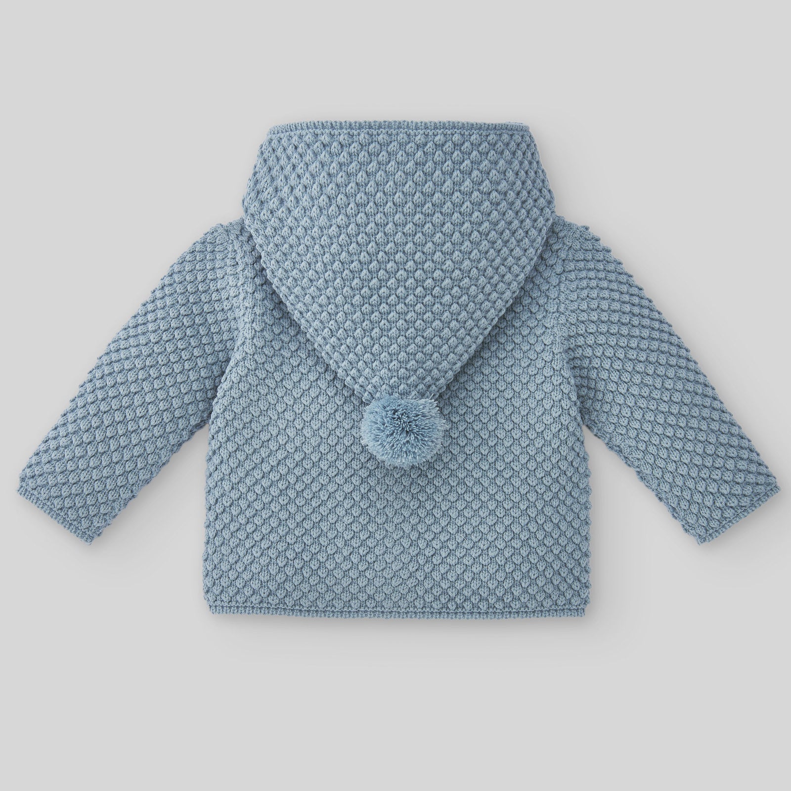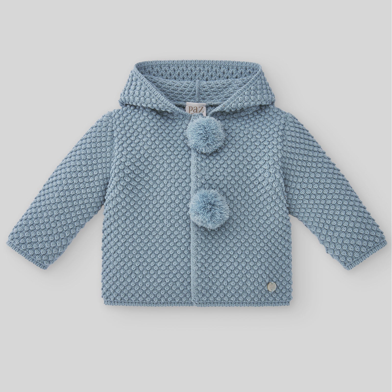 Chaquetón exterior en punto tricot grueso, para bebé unisex, con dos pompones centrales y uno trasero en el pico de la capucha. Placa decorativa PAZ Rodríguez.