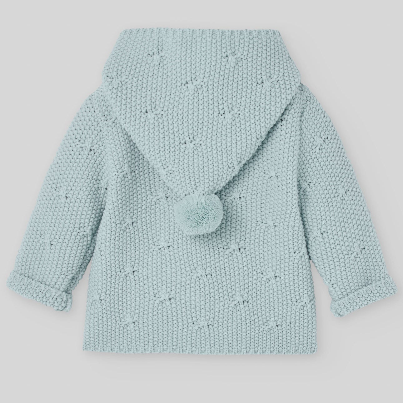 Chaquetón de punto con capucha y pompones decorativos, tejido tipo semilla con interior de algodón suave, ideal para los días fríos.