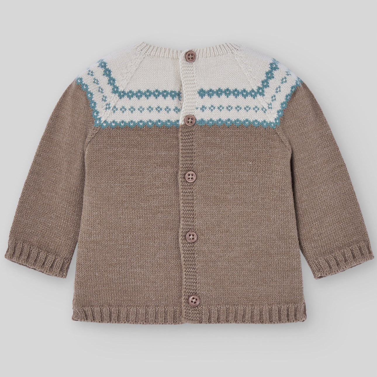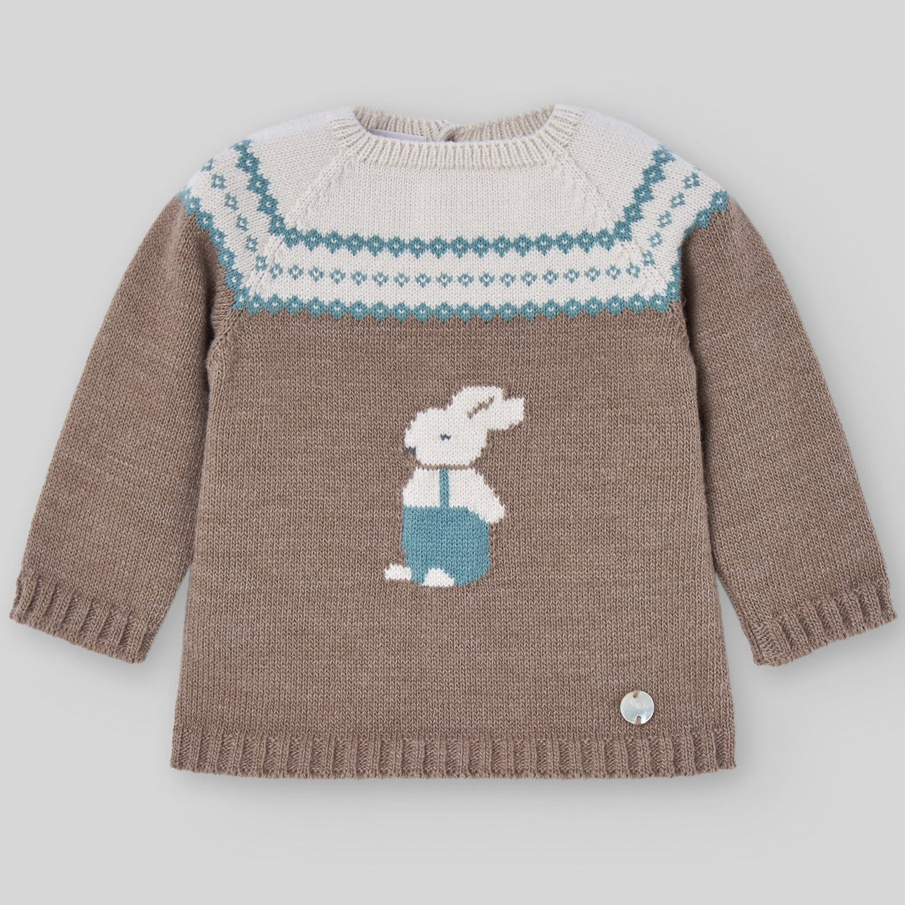 Conjunto suéter de manga larga con motivo de conejo en jacquard en la parte delantera. Cuello redondo y canesú con diseño geométrico en contraste. Su tejido de punto grueso lo hace ideal para los días más fríos con polaina s/pie a juego.