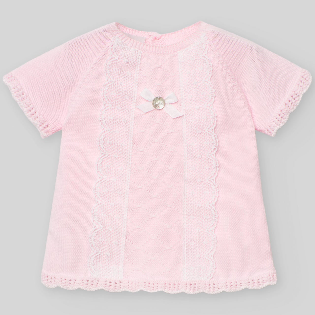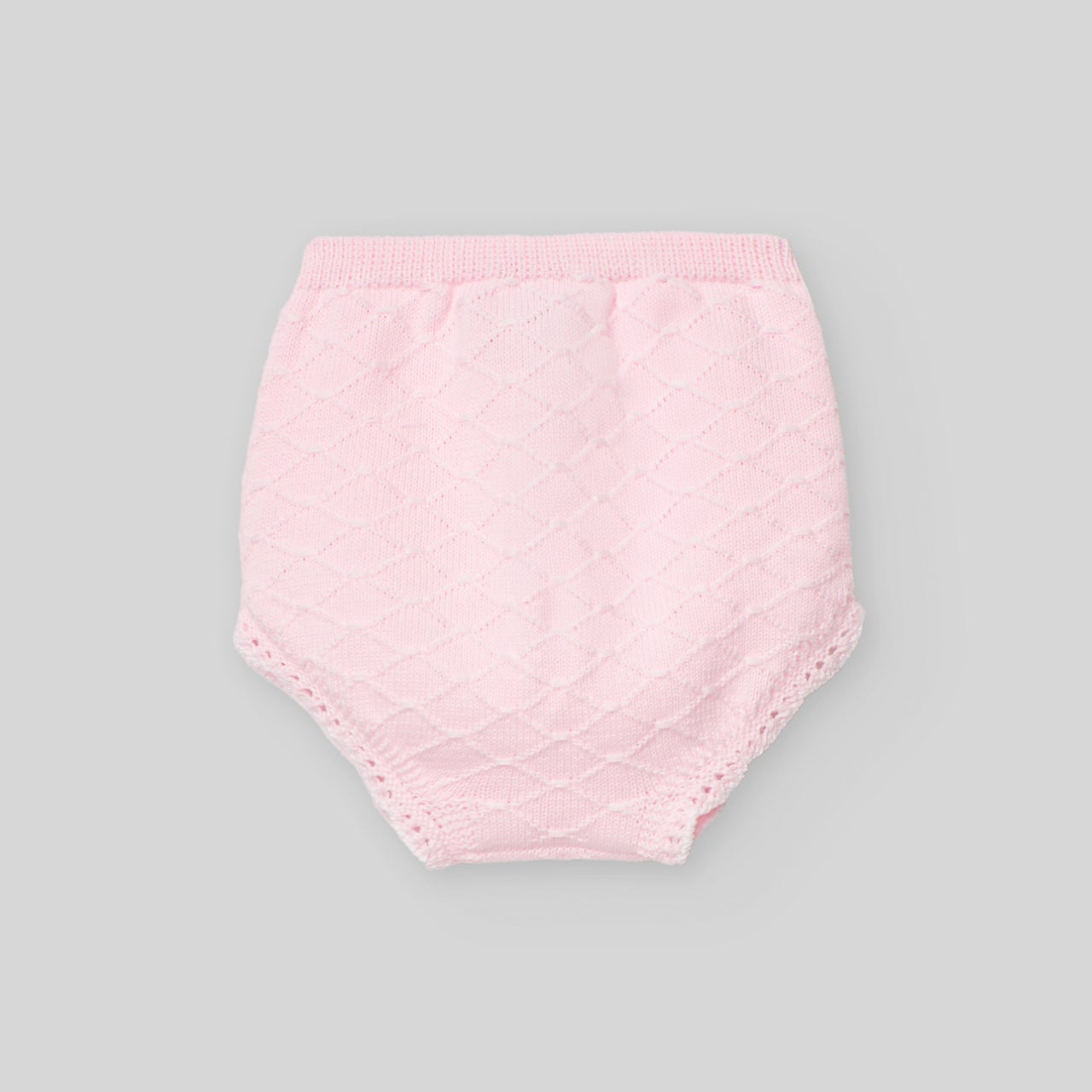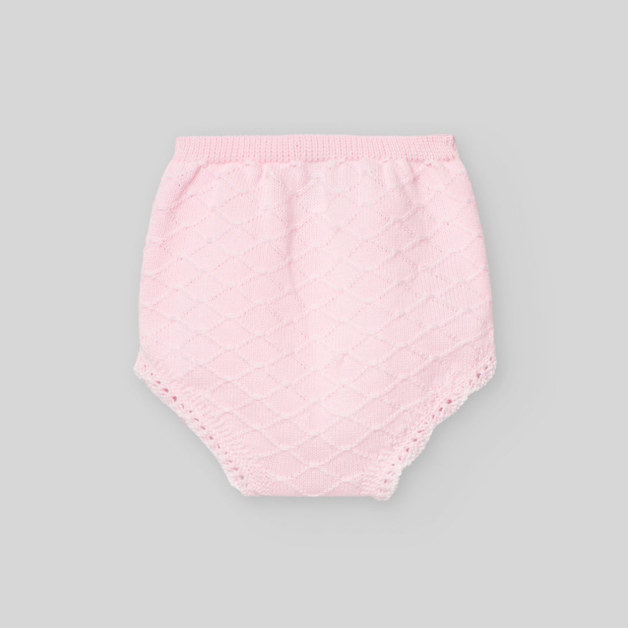 Conjunto jersey para bebé niña con un encantador estilo clásico, manga corta y detalle de puntillas y rombos en la parte delantera. Detalle de lazada en el pecho con placa de nácar PAZ. Remate de ondas. Se abrocha en la parte trasera con botones a juego con braga de punto con detalles rombos y remate hecho a mano. Cintura alta elástica para mayor confort.