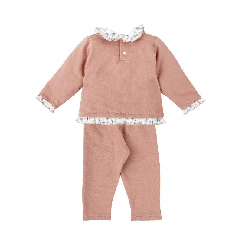 Conjunto de felpa suave para bebé es ideal para entretiempo y días más frescos. La camiseta en tono terracota incluye un delicado cuello bebé con volante en tejido estampado floral, a juego con los puños y el bajo fruncido. El protagonista del diseño es el simpático aplique de casita en el centro, realizado también con el mismo tejido floral, que aporta un toque entrañable y lleno de ternura.