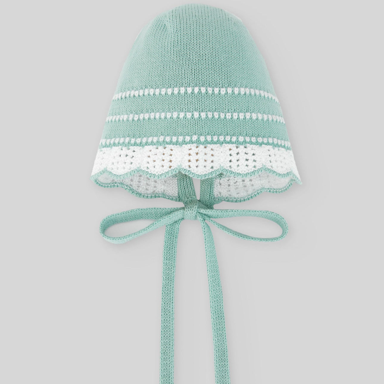 Capota de punto para bebé con remates de puntilla en punto contrastado. Remate de onditas. Lazada con placa de nácar PAZ. Cordones ajustables. Combinable con la colección EIDO de Paz Rodríguez.