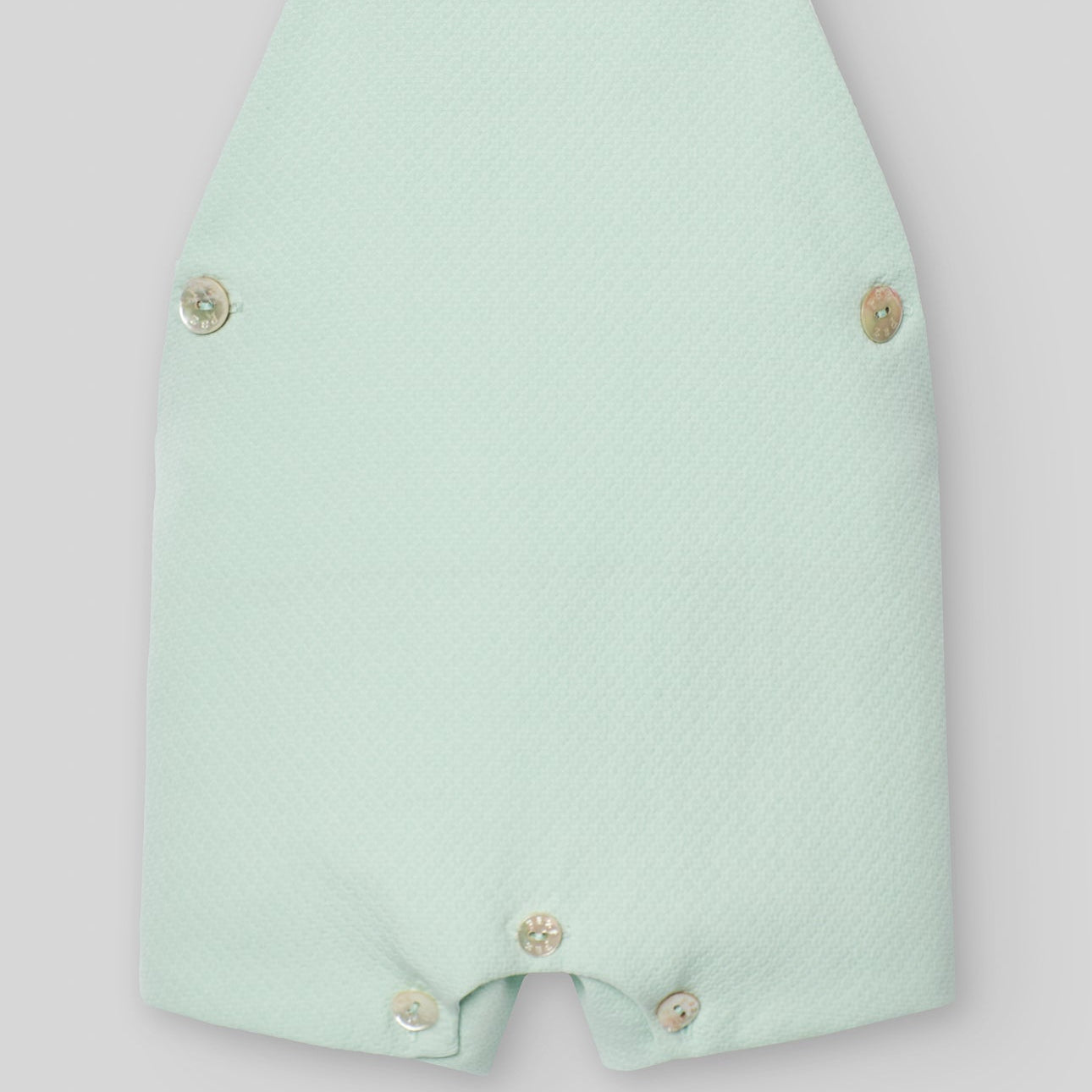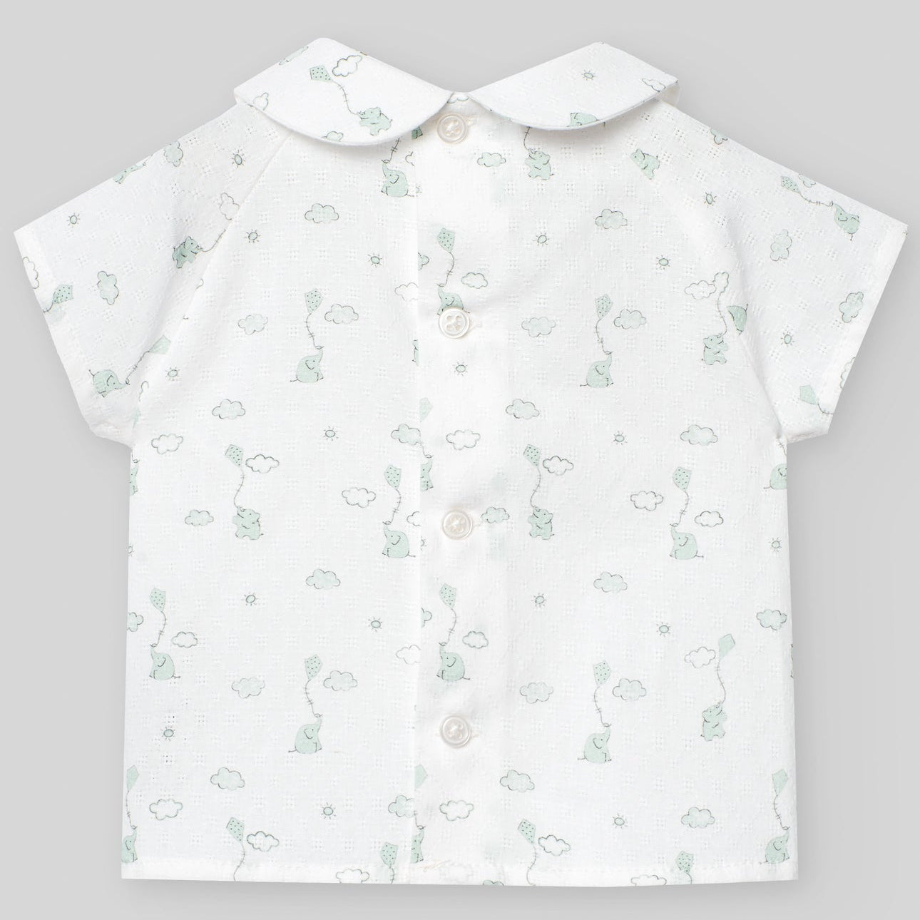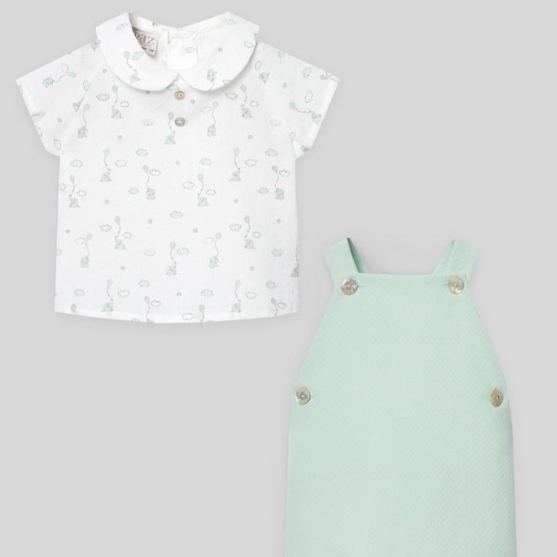 Conjunto blusa para bebé niño con cuello bebé en tejido con un dulce estampado de elefantitos. Cuello bebé con botones de nácar decorativos. De manga corta y cierre trasero con botones a tono para mayor confort, con peto corto para niños en tejido piqué. Tirantes con cierre de botón de nácar. Elásticos en ambos lados y botón de nácar decorativo. Abertura en la entrepierna para facilitar el cambio de pañal.