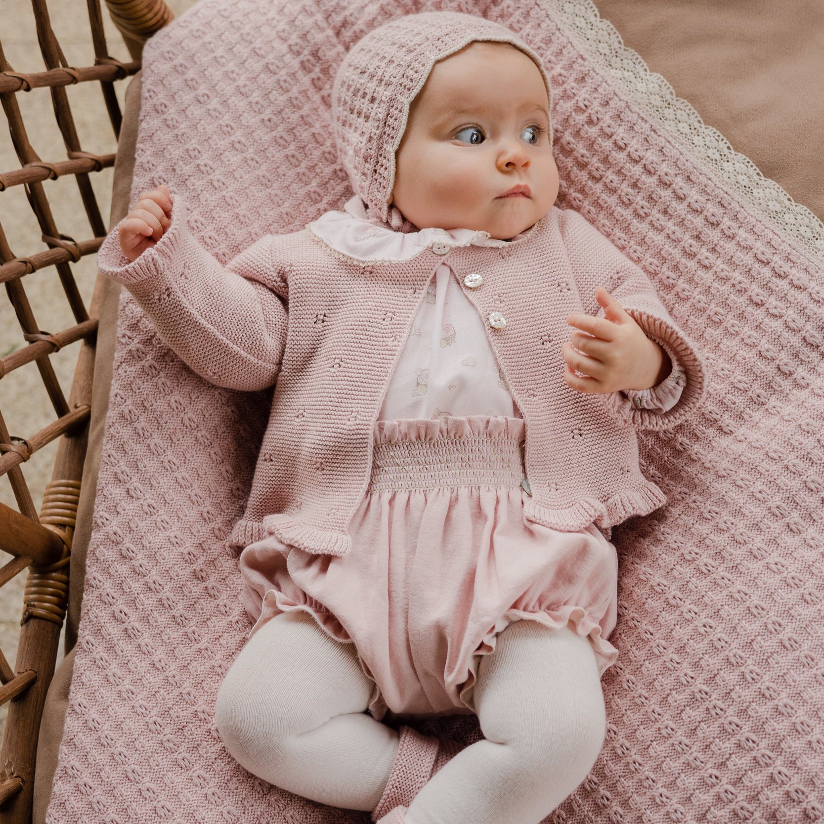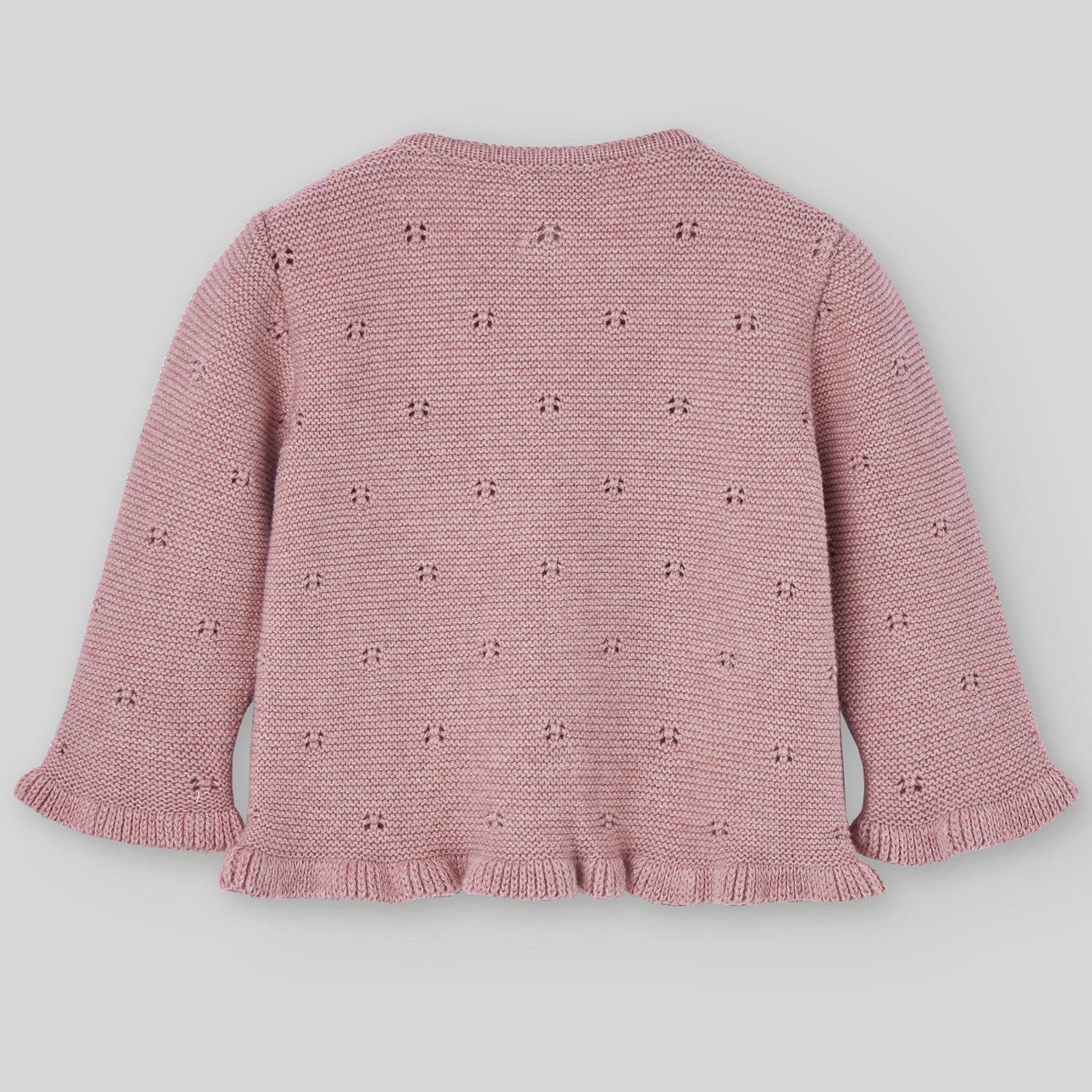 Chaqueta larga de punto para niña, confeccionada en una suave mezcla de algodón y cash meré con diseño calado distribuido por toda la prenda. Presenta cuello redondo, cierre frontal con botones y remate de volante en el bajo y los puños que aporta movimiento y detalle al diseño. Su tacto cálido y confortable la convierte en una prenda perfecta tanto para el día a día como para ocasiones especiales, combinando funcionalidad y estilo desde los primeros meses hasta los 6 años.