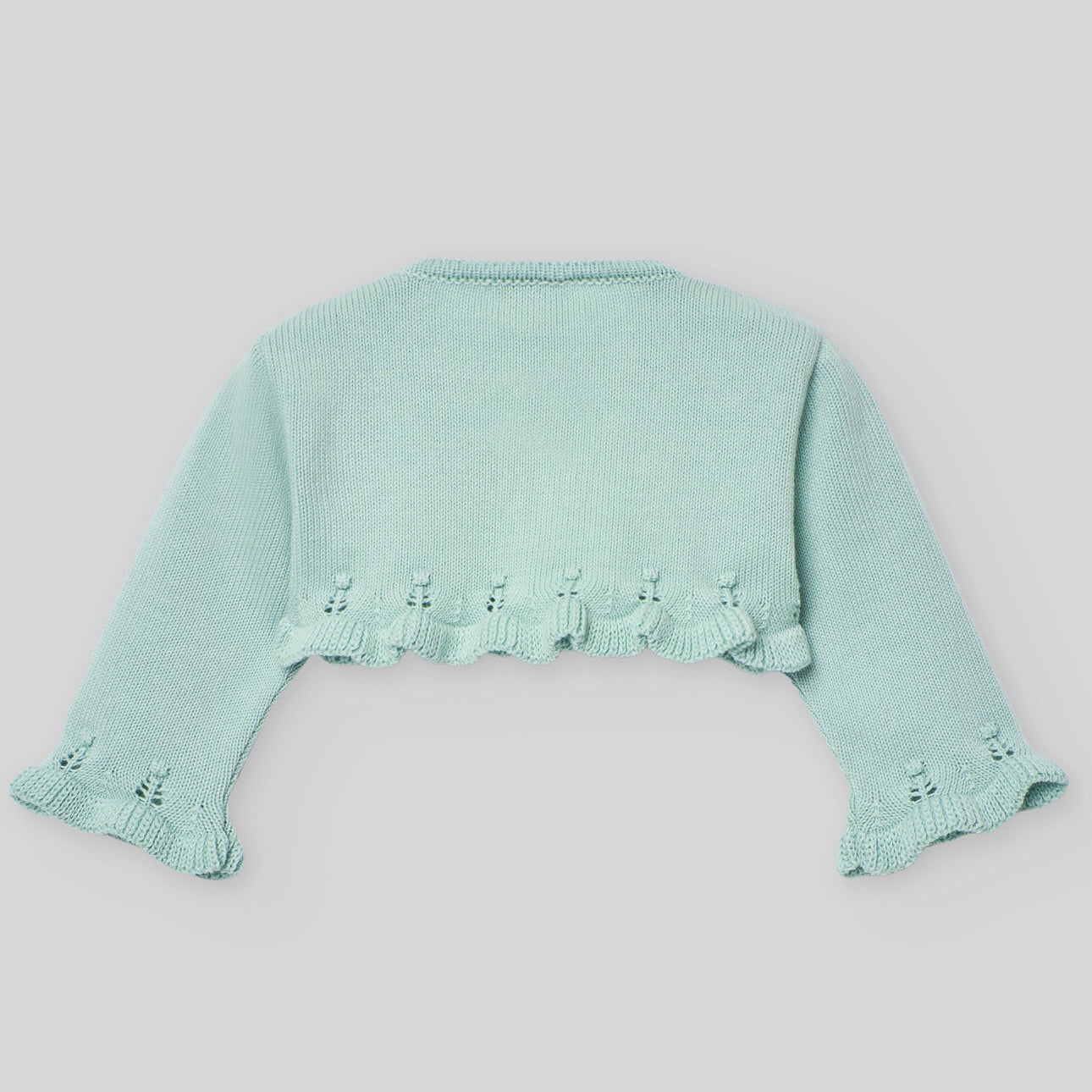 Chaqueta corta de punto para bebé niña, ideal para completar su look. Con cuello redondo y remates en volantes, esta prenda se cierra con dos botones de nácar, aportando un toque delicado y elegante. Colección Bico de Paz Rodríguez.