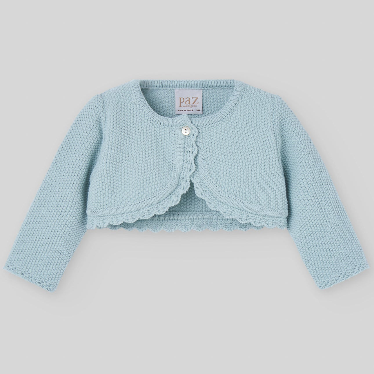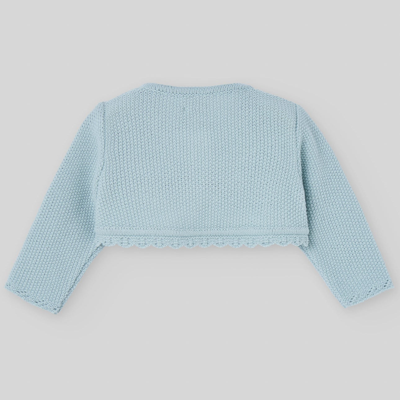 Chaqueta corta de punto para bebé, confeccionada en algodón suave con punto bobo. Presenta un diseño ligeramente redondeado en el delantero y remates de ondas de crochet en cuello, bajo y mangas. Su cierre superior con botón nacarado la hace ideal para combinar con vestidos, ranitas o peleles, aportando un acabado delicado y femenino.