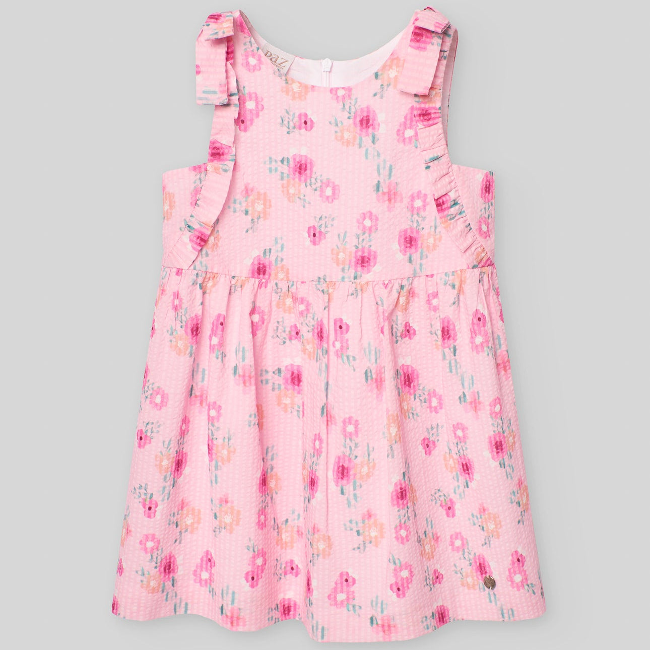 Vestido infantil para niñas en estampado floral. Sin mangas, presenta lazadas en los hombros y detalle de volantes en el pecho aportando un toque de dulzura. Cierre trasero con cremallera oculta. Chapa PAZ en el bajo.