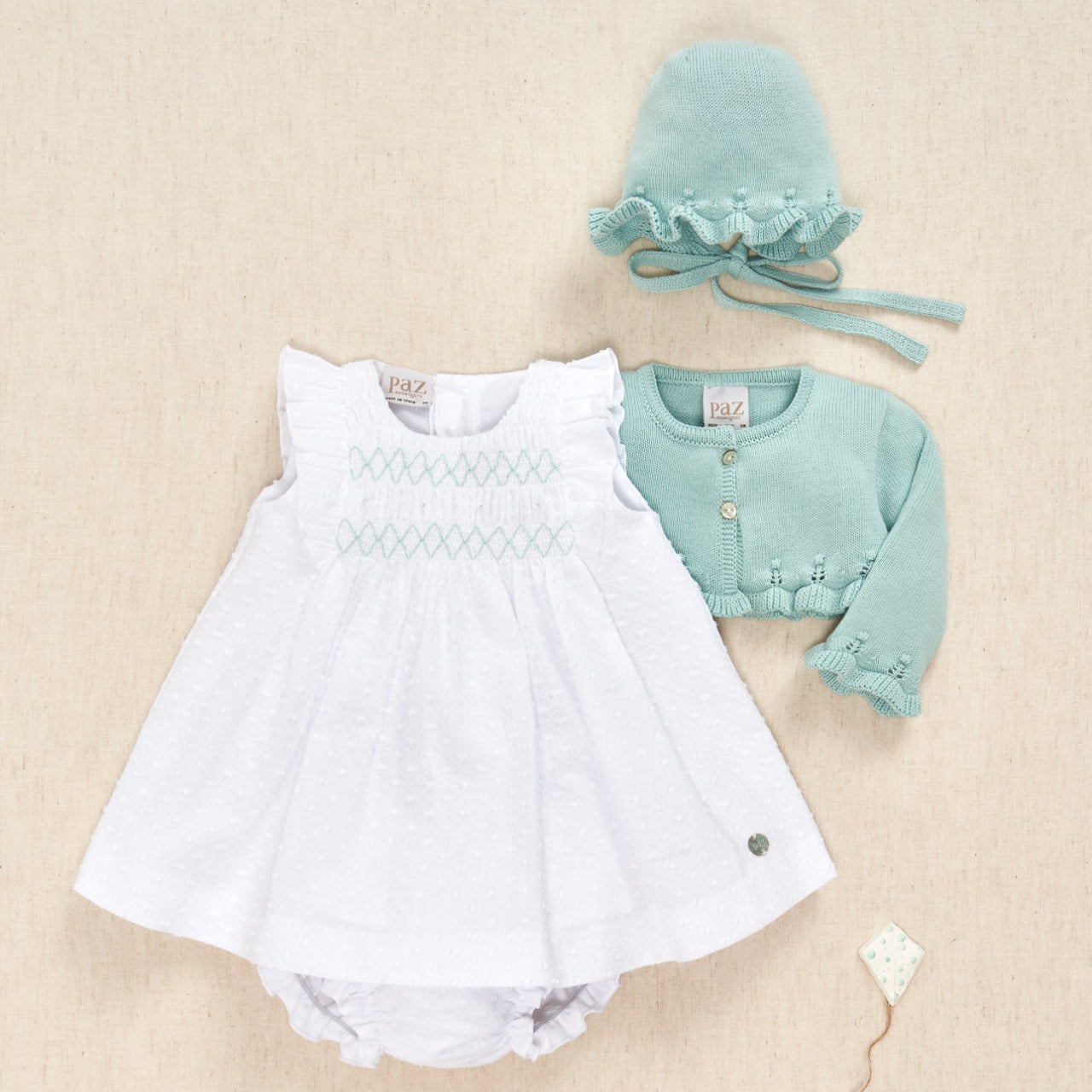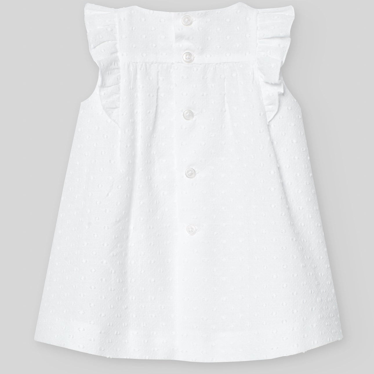 Vestido a la sisa en plumetty con nido de abeja a contraste en canesú y volantes en los hombros. Colección Eido de Paz Rodríguez.
