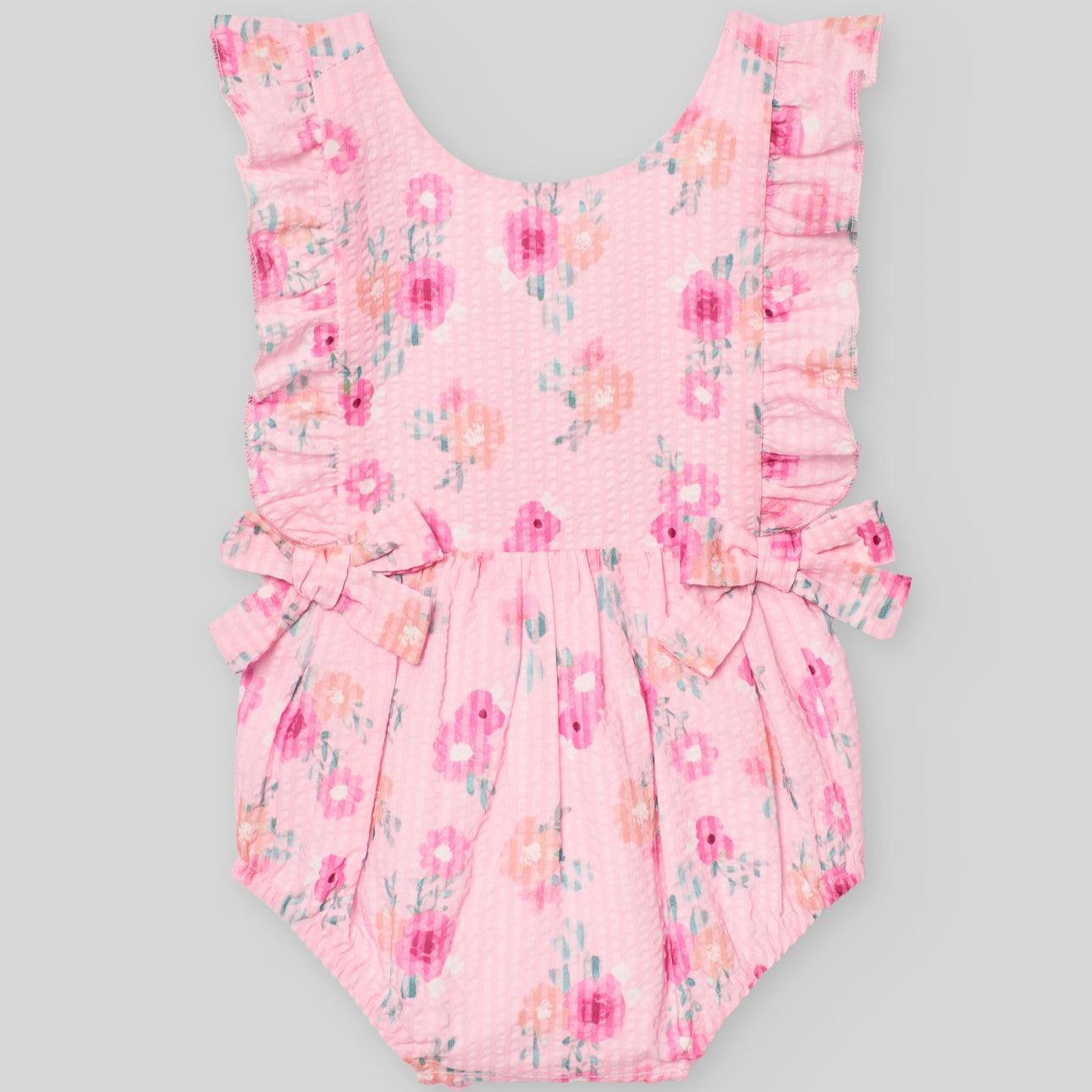 Bombacho floral para niña de la clásica marca Paz Rodríguez. Confeccionado en algodón suave y ligeramente texturizado. Con acabados con volantes y lazos fijos en la parte delantera, totalmente forrados para mayor comodidad. Se abrocha con botones entre las piernas.