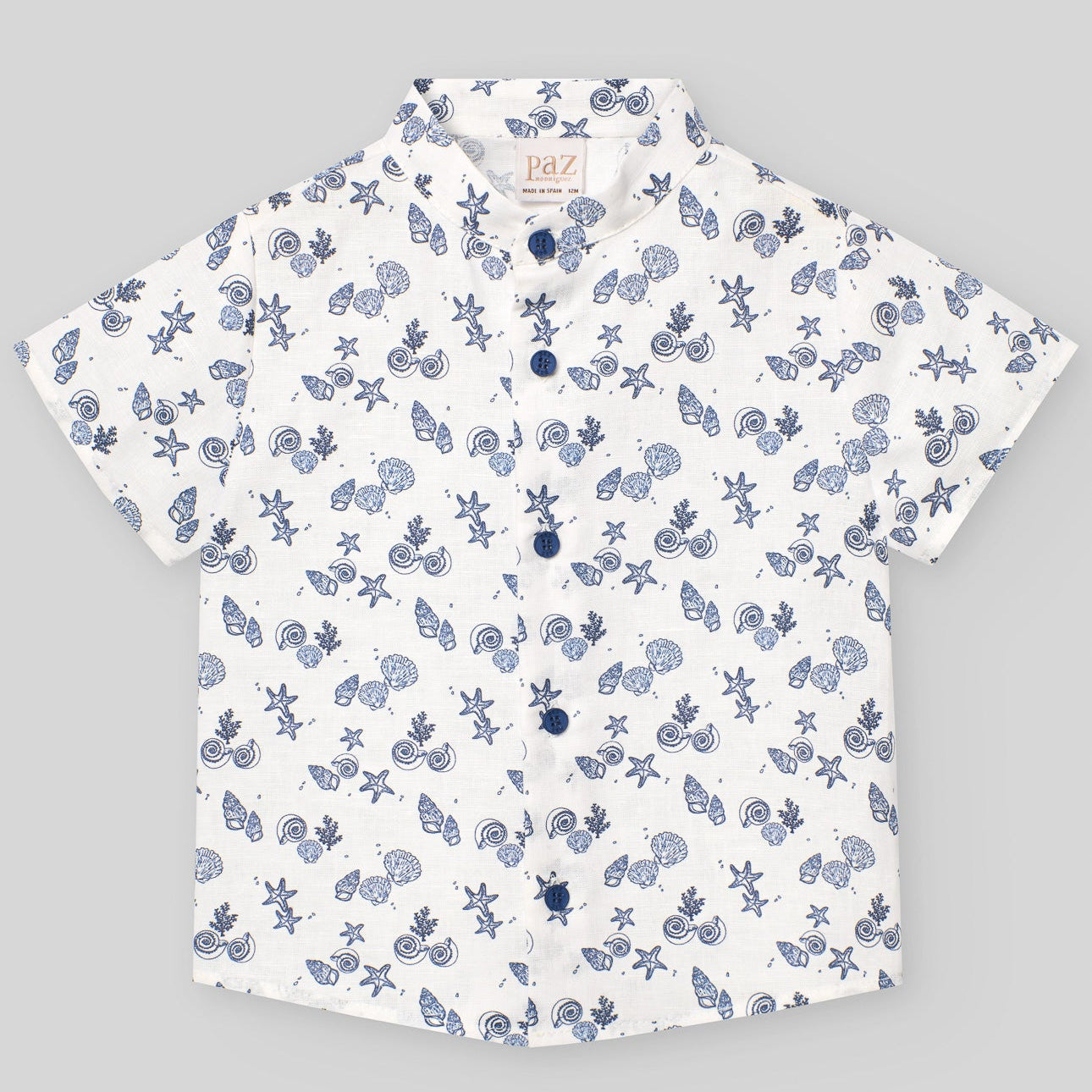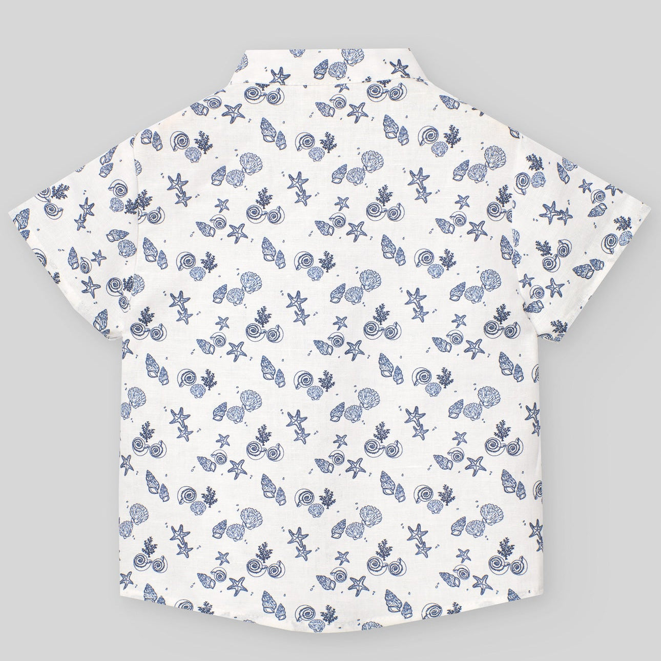 Conjunto camisa de cuello corto y manga corta. Cierre frontal con botones. Estampado marítimo con shorts o bermudas con banda interior ajustable y cierre frontal con botones. Bolsillos delanteros y un bolsillo trasero con detalle de apliques.