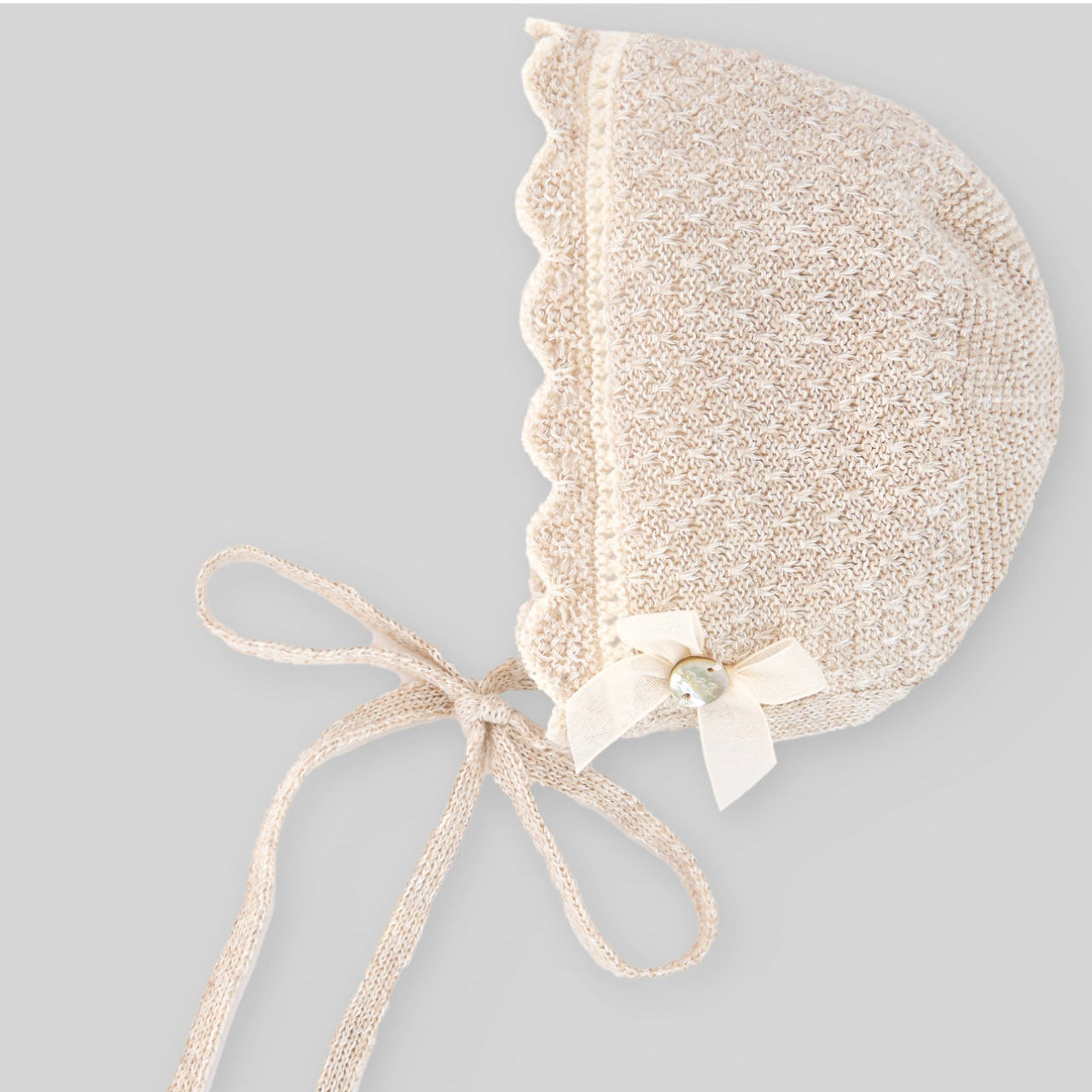 Gorro de bebé de punto texturizado con detalles festoneados en contraste. Lazo de cinta en tela con etiqueta de nácar PAZ. Cordones ajustables. Perfecto para combinar con la colección AREA.