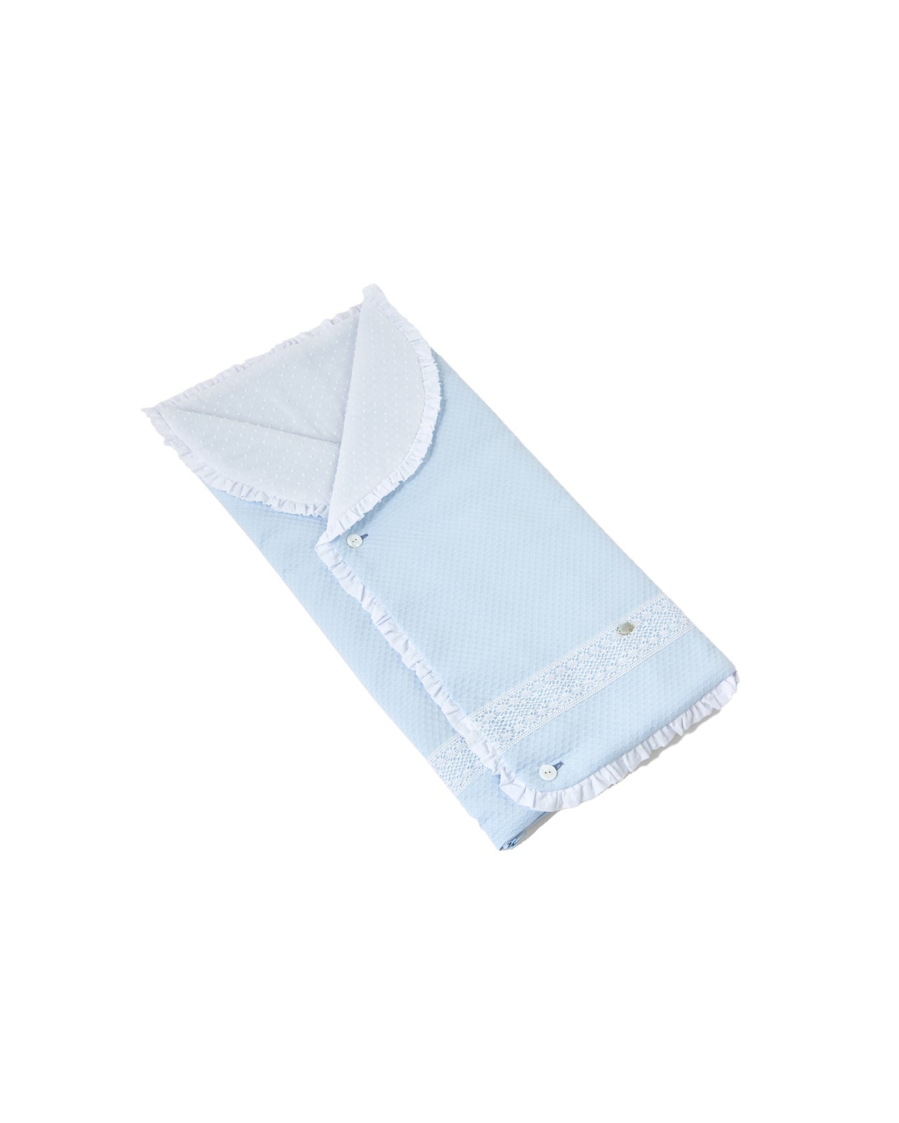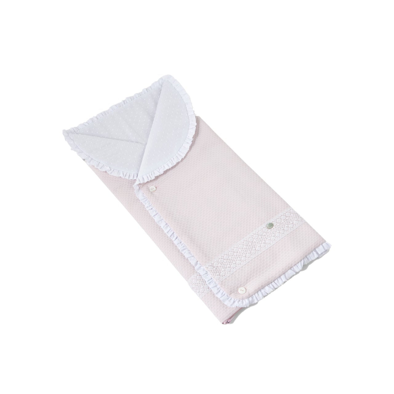 Saco nana de tejido piqué con interior de plumeti, con adorno entredós ancho y botones como cierre. Se abre totalmente para usar de cambiador. Tiene ojales traseros para porta bebé. Ideal para portar al bebé.